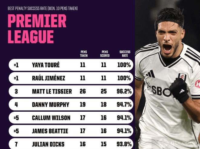 排名第三的是勒蒂塞尔,他一共26罚25中,这个命中率虽然不是百分之百,但是难度不亚于11罚11中。此外,丹尼墨菲的19罚18中、威尔逊的17罚16中和詹姆斯比蒂的17罚16中同样具有不小的难度。这份榜单中,英超传奇球星亨利25罚23中,只罚丢了两次。